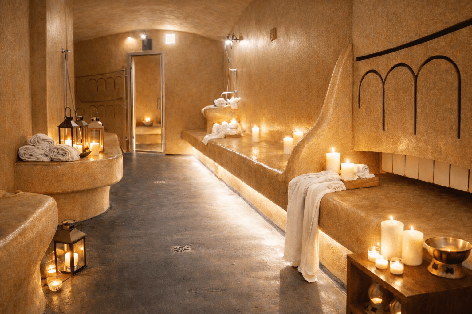 L’esperienza inizia dagli spogliatoi, dove il tempo quotidiano si interrompe. Qui l’ospite lascia alle spalle il mondo esterno e indossa la fouta, simbolo di semplicità e ritorno all’essenziale. È il primo gesto di transizione: dall’attività al riposo, dal negotium all’otium.